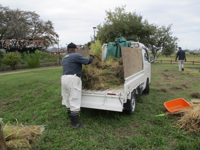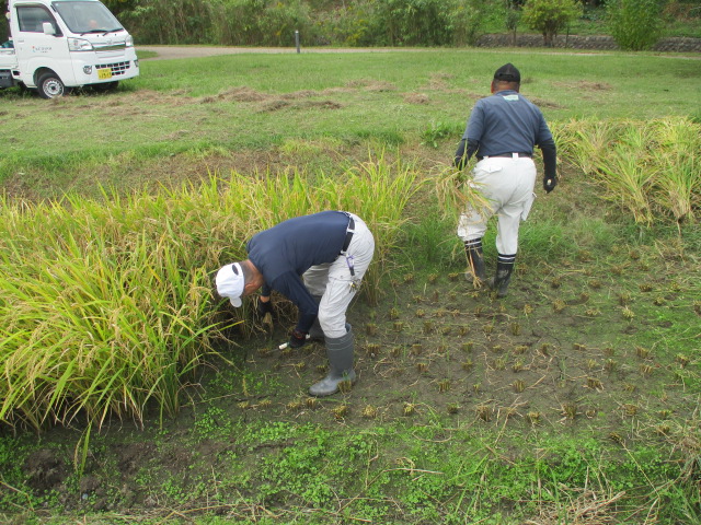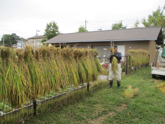 稲刈りは25日㈯スタッフで行い、現在 天日と風で乾燥させる昔ながらの方法で、倉庫横のフェンスに稲架がけにしています。これは天日乾燥させることで、葉や茎の養分が籾に凝縮され、米の旨味や食味が向上すると言われているもので、米作り担当スタッフが米の水分量をはかって、良い状態の時に脱穀をして、精米する予定です。(きっと甘くておいしいお米になると思います( ´∀` ))